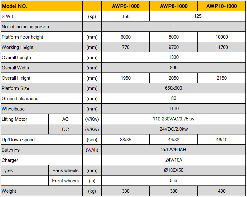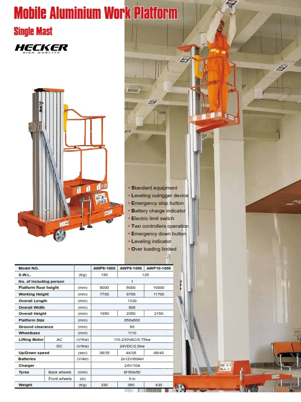 แพลตฟอร์มอลูมิเนียมเคลื่อนที่ Mobile Aluminium Work Platform AWP series ( Single Mast) แพลตฟอร์มอลูมิเนียมเคลื่อนที่ Mobile Aluminium Work Platform AWP series ( Single Mast) แพลตฟอร์มอลูมิเนียมเคลื่อนที่ เสาเดี่ยวอุปกรณ์มาตรฐานปุ่มหยุดการทำงานชั่วคราวมาตรวัดการชาร์จแบตเตอรี่สวิตช์ จำกัด กระแสไฟฟ้าการควบคุมสามารถทำได้ 2 จุดปุ่มลงฉุกเฉิน Specifications Catalog Video Review How to chose Specifications Catalog Video Review How to chose วิธีการเลือกรถโต๊ะยก Lift table
